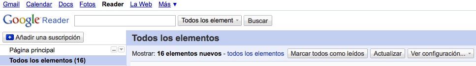 Yo uso habitualmente el lector de RSS que me da mi cuenta de correo Gmail, que se llama Reader. Éste se ubica en la parte superior de mi cuenta de correo, y desde allí accedo a las múltiples webs, blogs.. a los que estoy suscrito (periódicos, noticias, blogs o webs de educación, de deportes...)